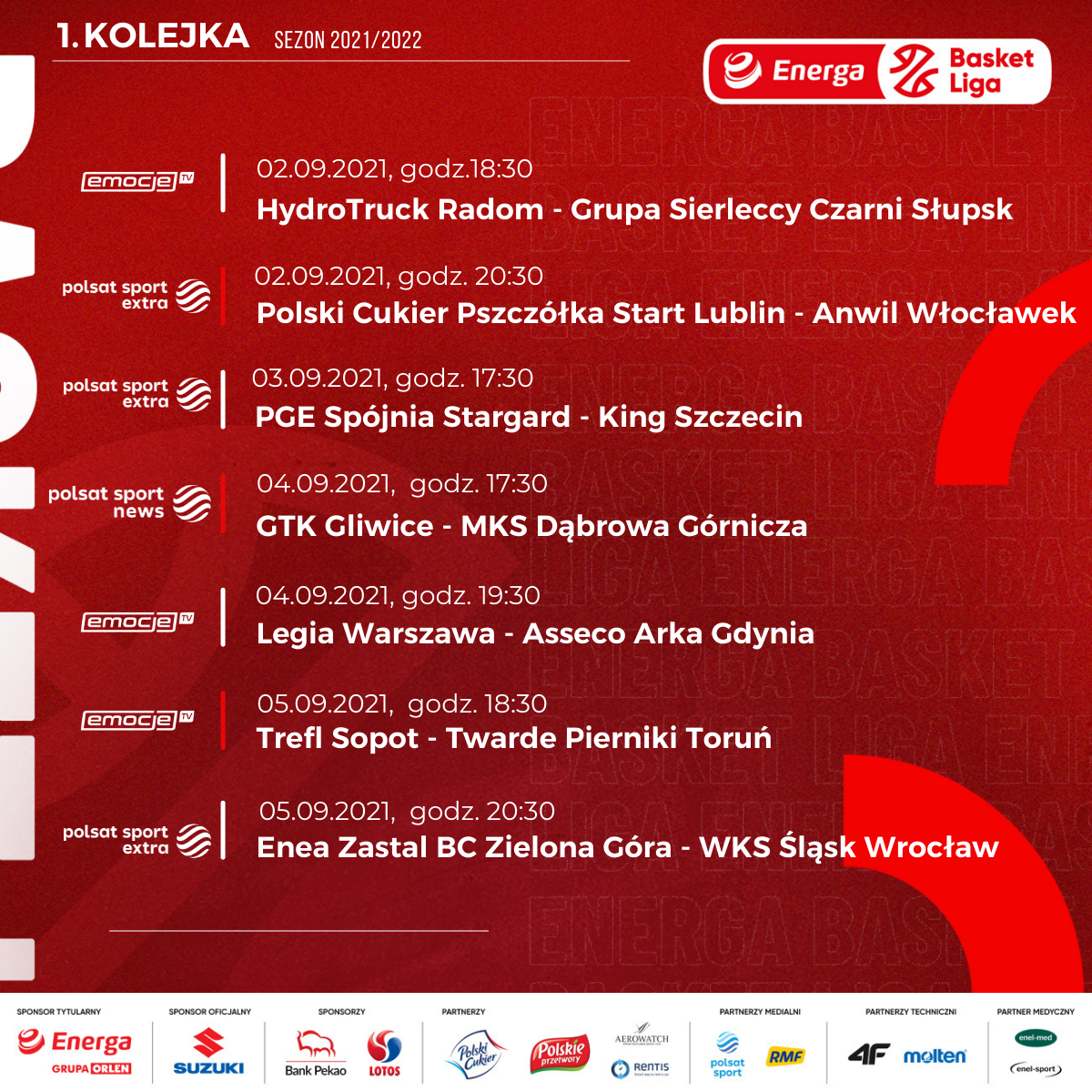 W czwartek, zaraz po spotkaniu o Suzuki Superpuchar Polski, pora na rozpoczęcie rywalizacji w Energa Basket Lidze! Cztery spotkania będzie można zobaczyć w sportowych stacjach Polsatu, pozostałe dostępne będą w serwisie Emocje.TV
