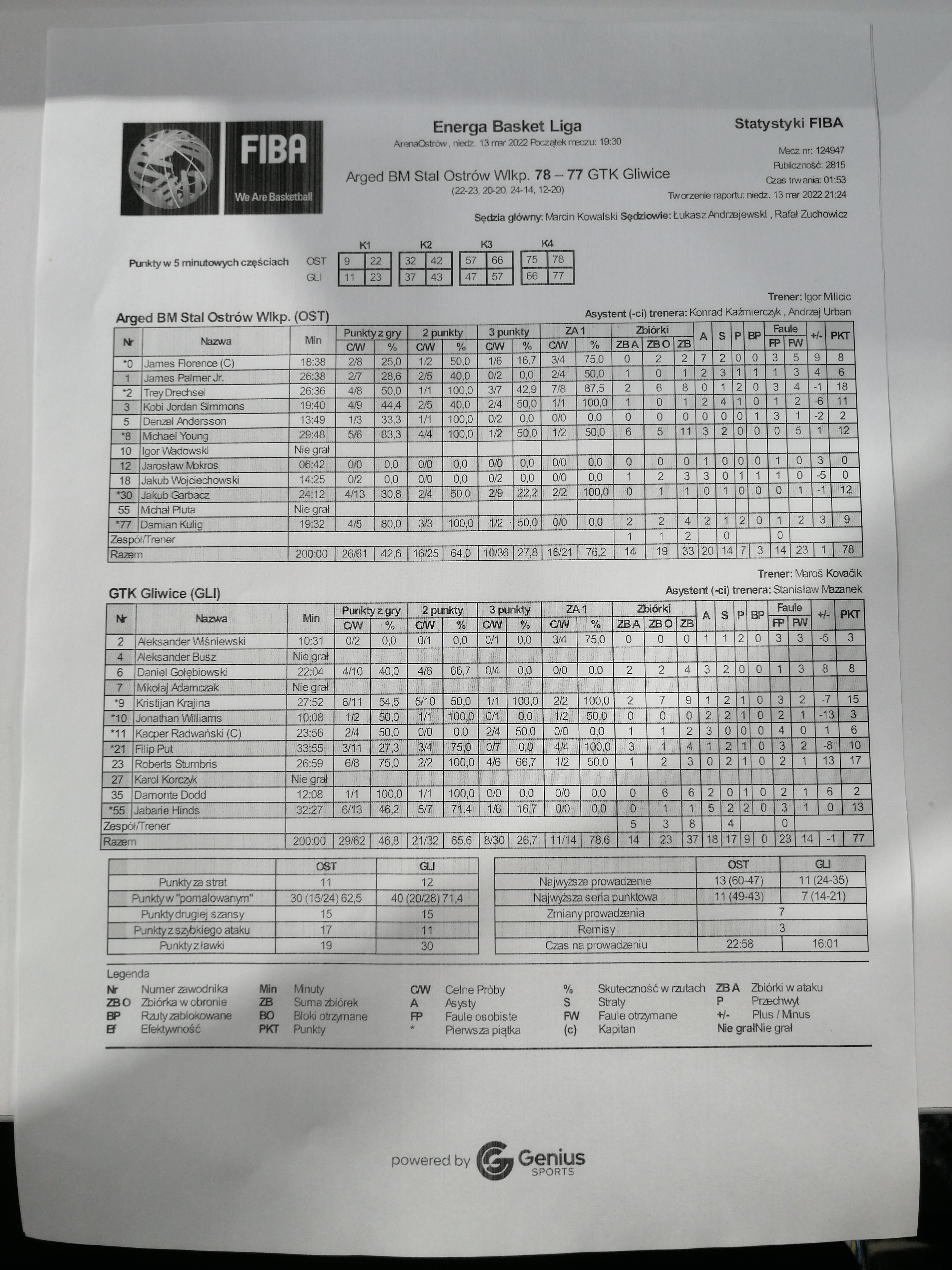 | Punkty graczy z ławki | 19 | 30 |