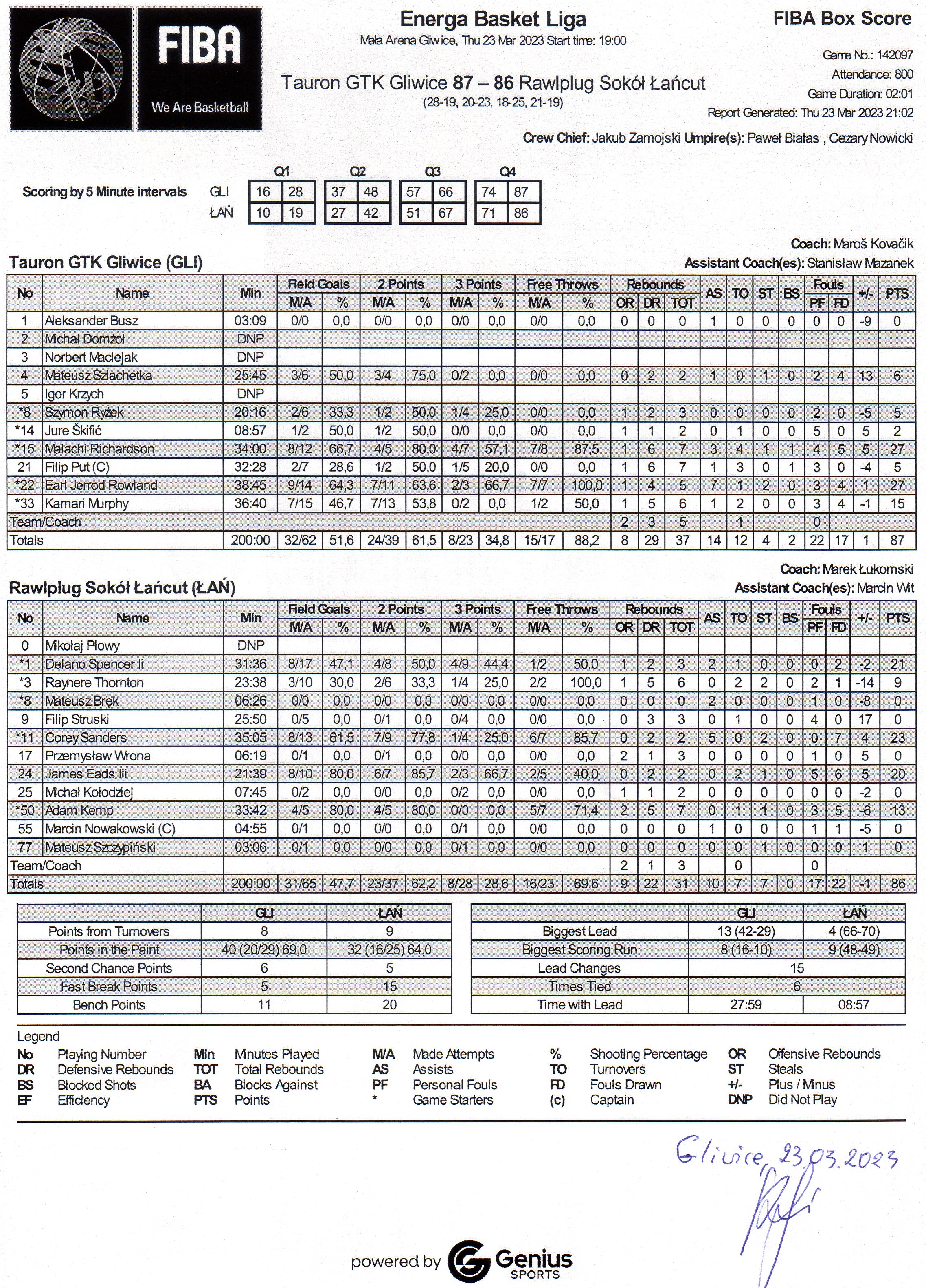 Runda Zasadnicza - 24 kolejka 23.03.2023 / 19:00Mała Arena Gliwice, Akademicka 50, 44-100 Gliwice28:19/20:23/18:25/21:19