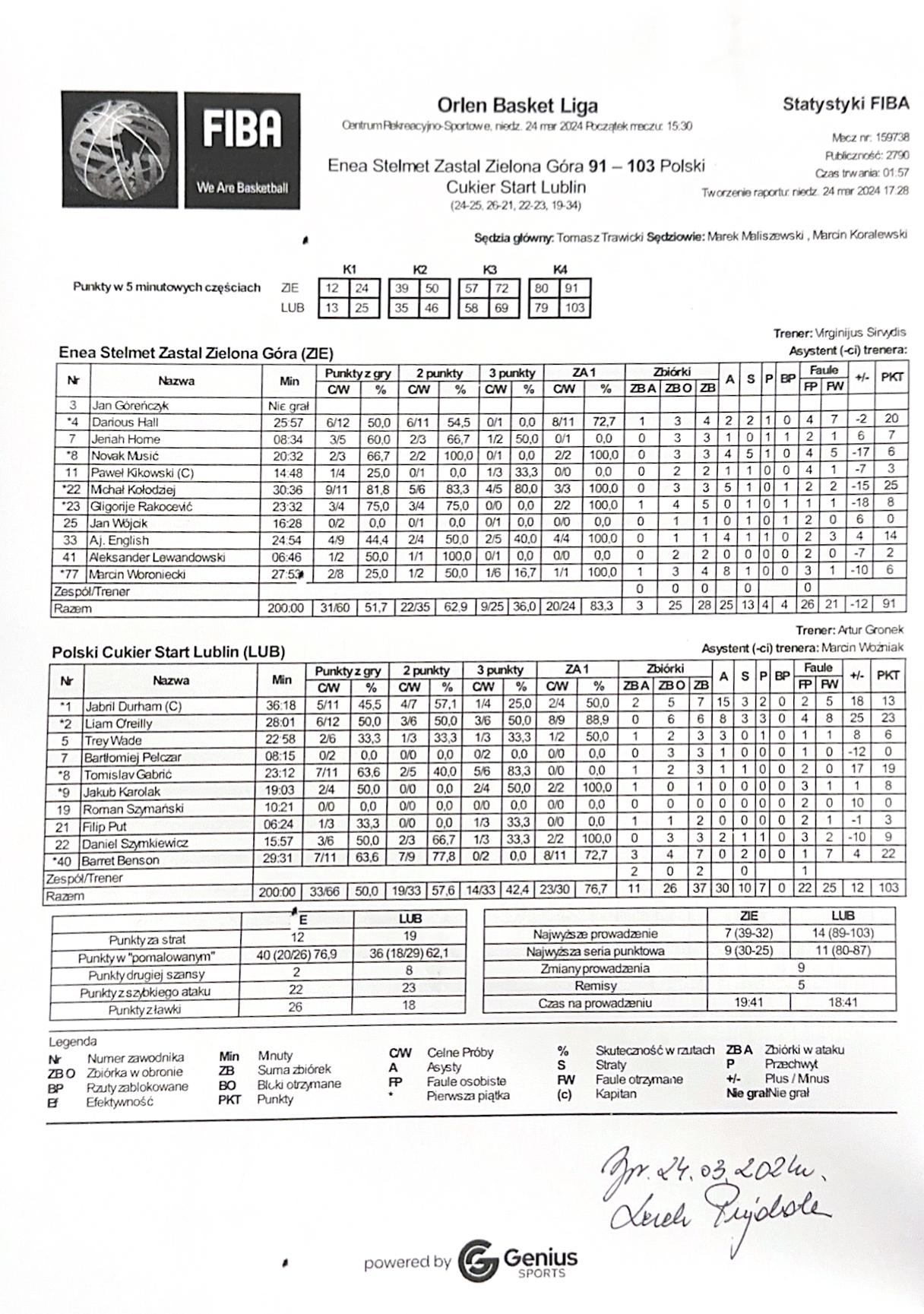 Runda Zasadnicza - 25 kolejka 24.03.2024 / 15:30Centrum Rekreacyjno-Sportowe, Sulechowska 41, 65-022 Zielona Góra24:25/26:21/22:23/19:34